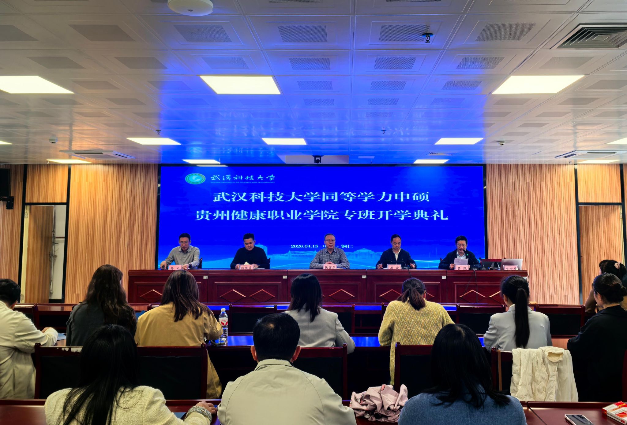 4月15日,武汉科技大学与贵州健康职业学院联合开设的同等学力申硕专班正式开班,继续教育学院党委书记张国华、副院长杨云、贵州健康职业学院党委委员副院长周斌、贵州健康职业学院党委教师工作部部长吴琨出席开班仪式,继续教育学院同等学力办公室工作人员、武汉科技大学(贵州)非学历教育管理基地负责人、贵州健康职业学院同等学力申硕新生代表参加了此次活动。