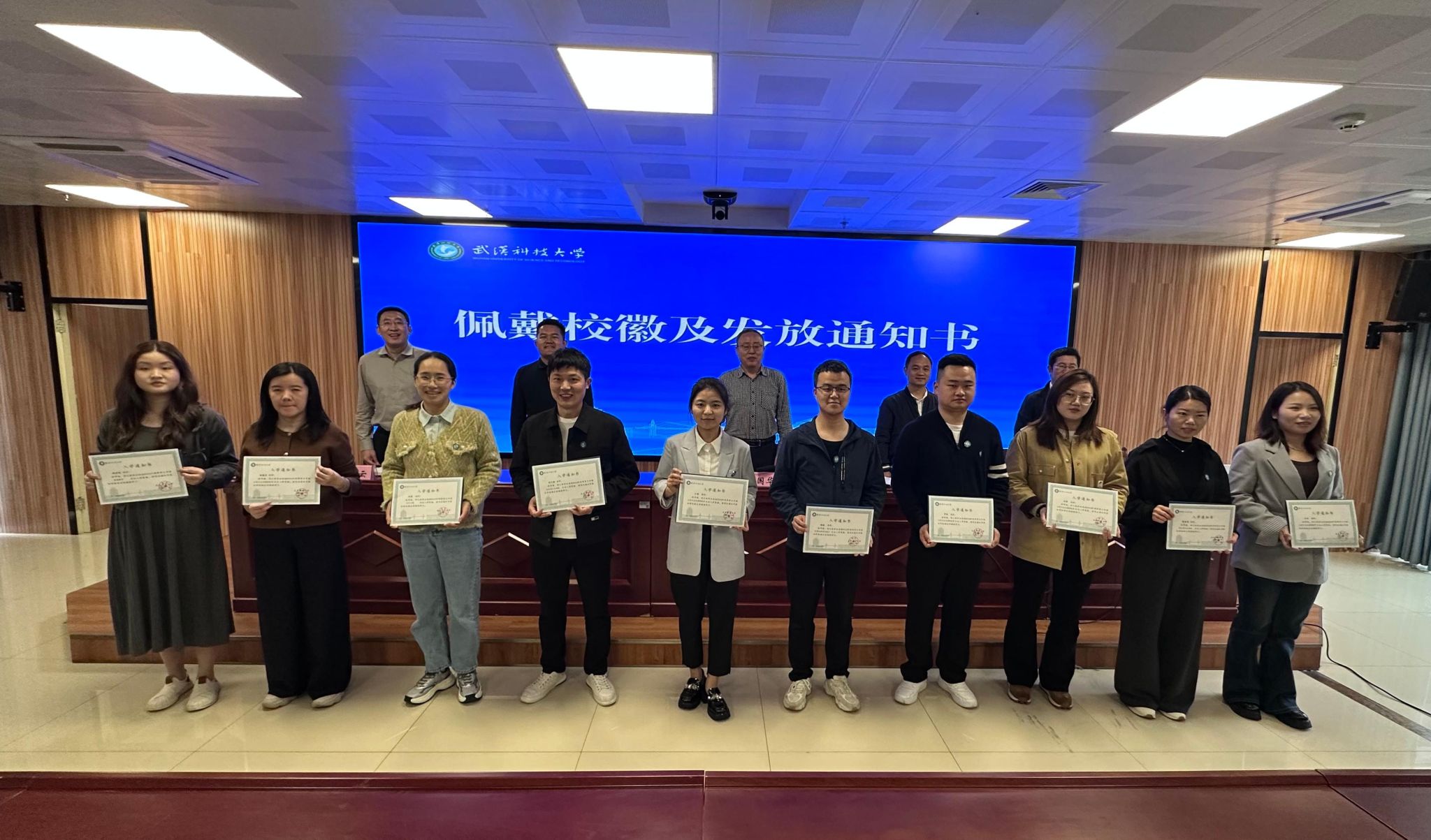 与会各位领导为新生学员代表们佩戴校徽、颁发入学通知书,合影留念。